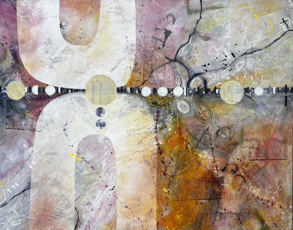 Often working with my own photographs – I edit to suit my need at the time. Images trigger the memory of place, the emotion & experience of it. My love of shape, texture, pattern & line are layered into the work as I progress intuitively, responding to what  has preceded. This process seems to allow the piece to find me once I’ve put in the work – I just need to pay attention.